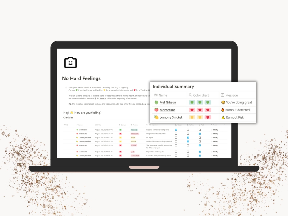 Inspired by a Slack app tackling burnout issue called Kona (https://www.heykona.com/), I decided to try recreating part of this app using Notion. It is just a fun clone idea and far from the original product, but it can help you become more aware of your workplace wellbeing. I hope you find it useful and integrate it into your daily work routine. Happy WFH! 🤗🤗🤗